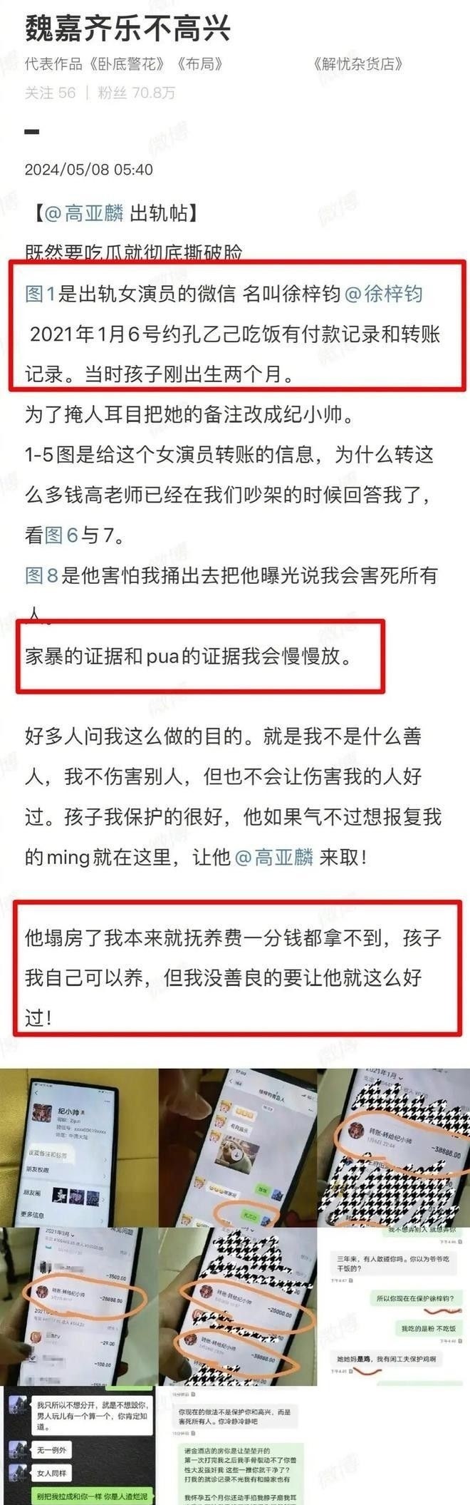 再看近期持续发酵的高亚麟相关争议:一边是关于其在伴侣孕晚期实施言语及行为伤害的多项指证,另一边则牵扯出向年轻女性大额转账、事件曝光后竟发起“网友众筹还款”的荒诞操作,被大量评论讥为“把私德危机当品牌危机来运营”。